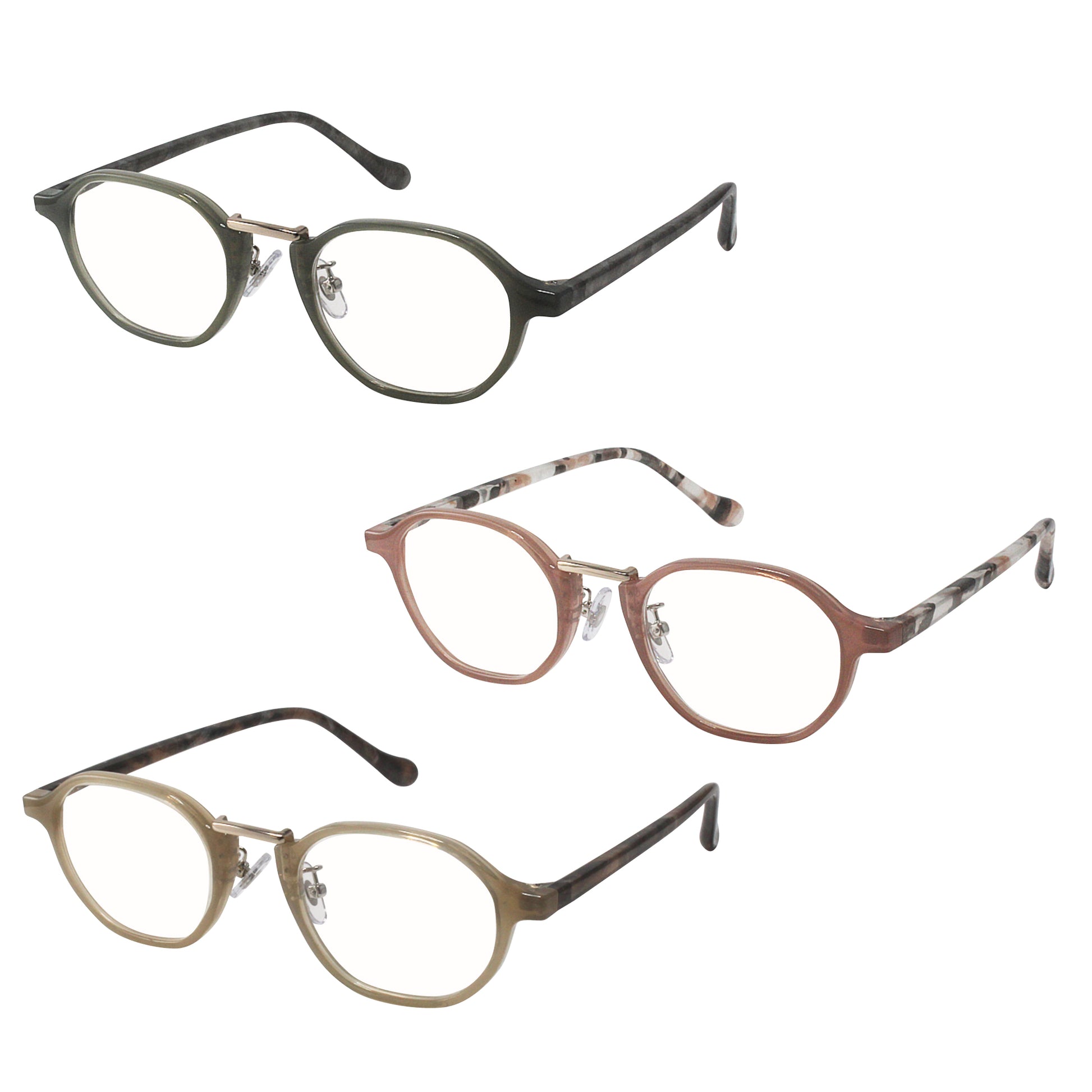 さりげないクラウンパントのシェイプと、マーブル柄のテンプルが特徴的なデザイン。かける人を選ばない馴染みやすいカラーラインナップ。鼻パッドで装着感も抜群です。