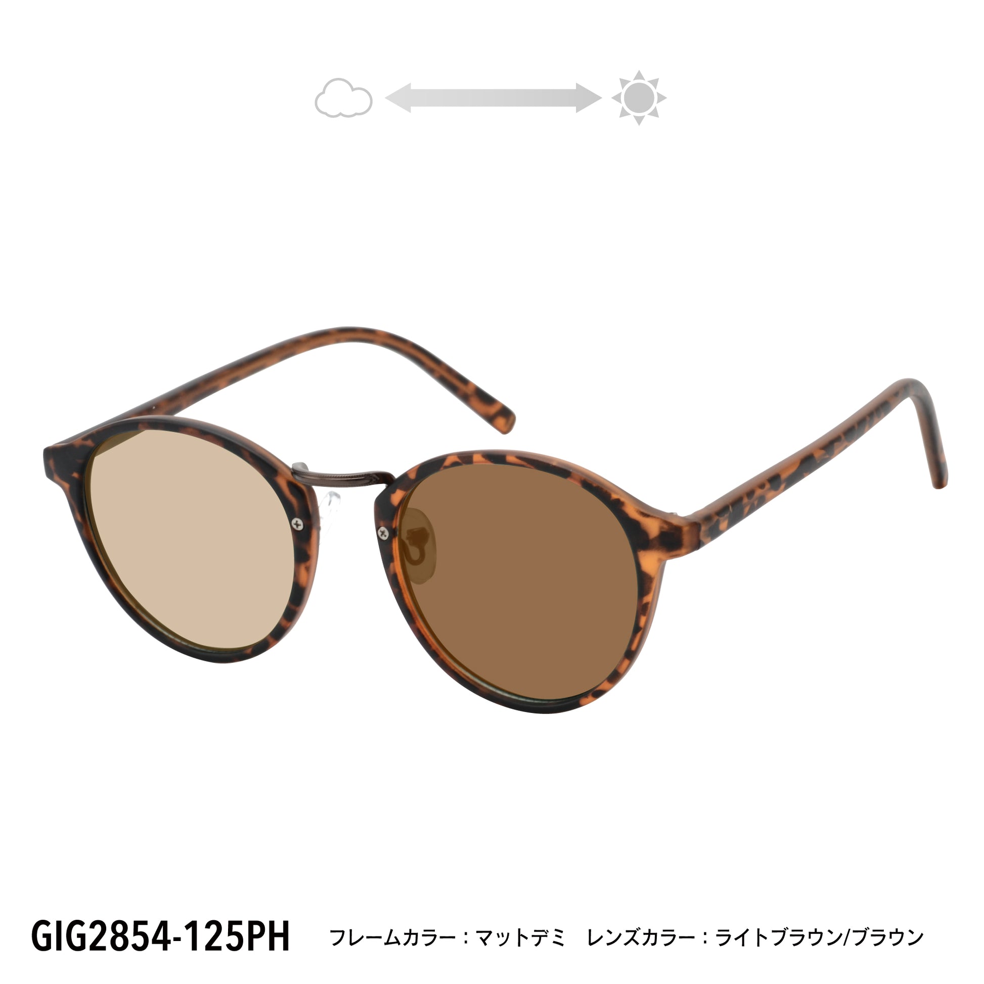 紫外線の量によってレンズの濃さが変わる調光機能と、路面などの反射を抑え見えやすくする偏光機能を兼ね備えたサングラス。マットな質感のフレームに、金属パーツがアクセントとなるボストンタイプのフレーム。紫外線99%カット。